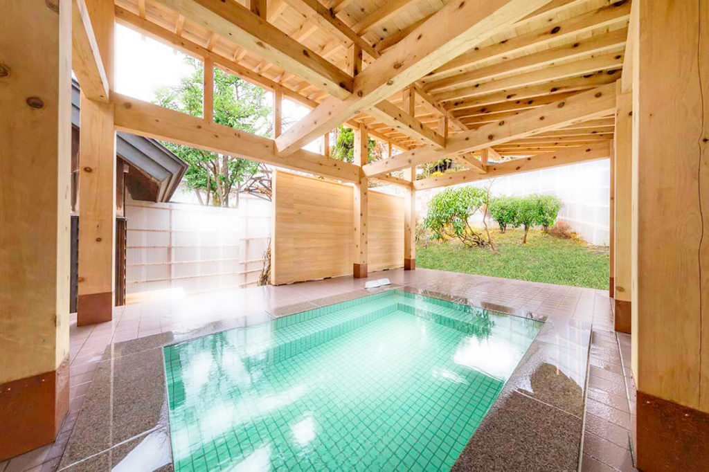 ナトリウム塩化物泉、源泉温度62.5℃、pH8.0。淡緑色透明、モール臭、微塩味、トロミ・ヌルスベ感。源泉掛け流し。